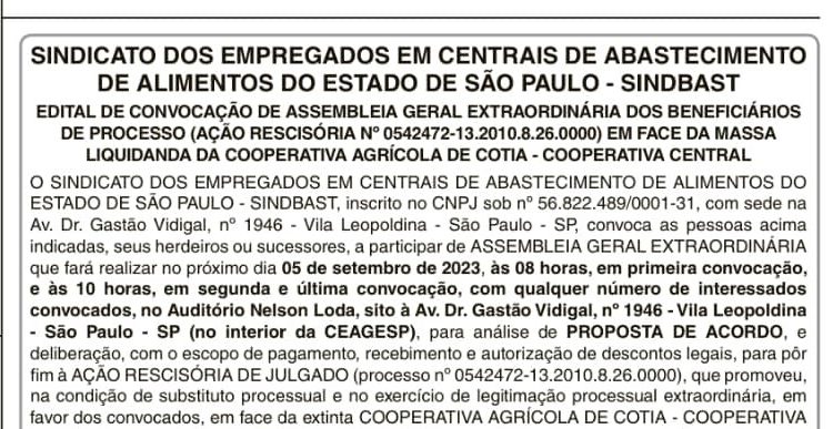Segue a íntegra do edital de convocação da assembleia para deliberação sobre a proposta apresentada pelos bancos. Será no dia 5/9, às 10:00 (segunda chamada), no auditório Nelson Loda, situado na Avenida Gastão Vidigal, 1946.