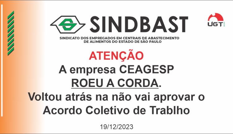 CEAGESPDestaque 19/12/23 – ATENÇÃO: A Empresa roeu a corda!!! CEAGESP por SINDBAST Última Atualização 19 dez, 2023 Compartilhar Após aprovado em Assembléia, a Empresa CEAGESP voltou atrás e não vai cumprir o acordo. Compartilhar FacebookTwitterGoogle+ReddItWhatsAppPinterestO email