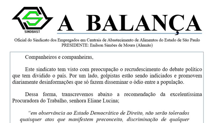 Este sindicato tem visto com preocupação o recrudescimento do debate político que tem dividido o país. Por um lado, golpistas estão sendo indiciados e promovem diariamente desinformações que só fazem disseminar o ódio entre a população.