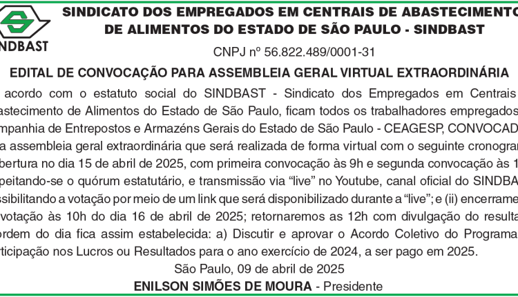 SINDICATO DOS EMPREGADOS EM CENTRAIS DE ABASTECIMENTO DE ALIMENTOS DO ESTADO DE SÃO PAULO – SINDBAST – CNPJ nº 56.822.489/0001-31 – EDITAL DE CONVOCAÇÃO PARA ASSEMBLEIA GERAL VIRTUAL EXTRAORDINÁRIA – De acordo com o estatuto social do SINDBAST – Sindicato dos Empregados em Centrais de Abastecimento de Alimentos do Estado de São Paulo, ficam todos os trabalhadores empregados na Companhia de Entrepostos e Armazéns Gerais do Estado de São Paulo – CEAGESP, CONVOCADOS para assembleia geral extraordinária que será realizada de forma virtual com o seguinte cronograma: i) abertura no dia 15 de abril de 2025, com primeira convocação às 9h e segunda convocação às 10h, respeitando-se o quórum estatutário, e transmissão via “live” no Youtube, canal oficial do SINDBAST, possibilitando a votação por meio de um link que será disponibilizado durante a “live”; e (ii) encerramento da votação às 10h do dia 16 de abril de 2025; retornaremos as 16h com divulgação do resultado. A ordem do dia fica assim estabelecida: a) Discutir e aprovar o Acordo Coletivo do Programa de Participação nos Lucros ou Resultados para o ano exercício de 2024, a ser pago em 2025. São Paulo, 09 de abril de 2025. Enilson Simões de Moura – Presidente.