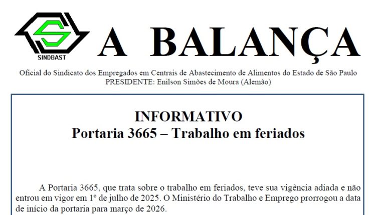 A Portaria 3665, que trata sobre o trabalho em feriados, teve sua vigência adiada e não entrou em vigor em 1º de julho de 2025. O Ministério do Trabalho e Emprego prorrogou a data de início da portaria para março de 2026.
