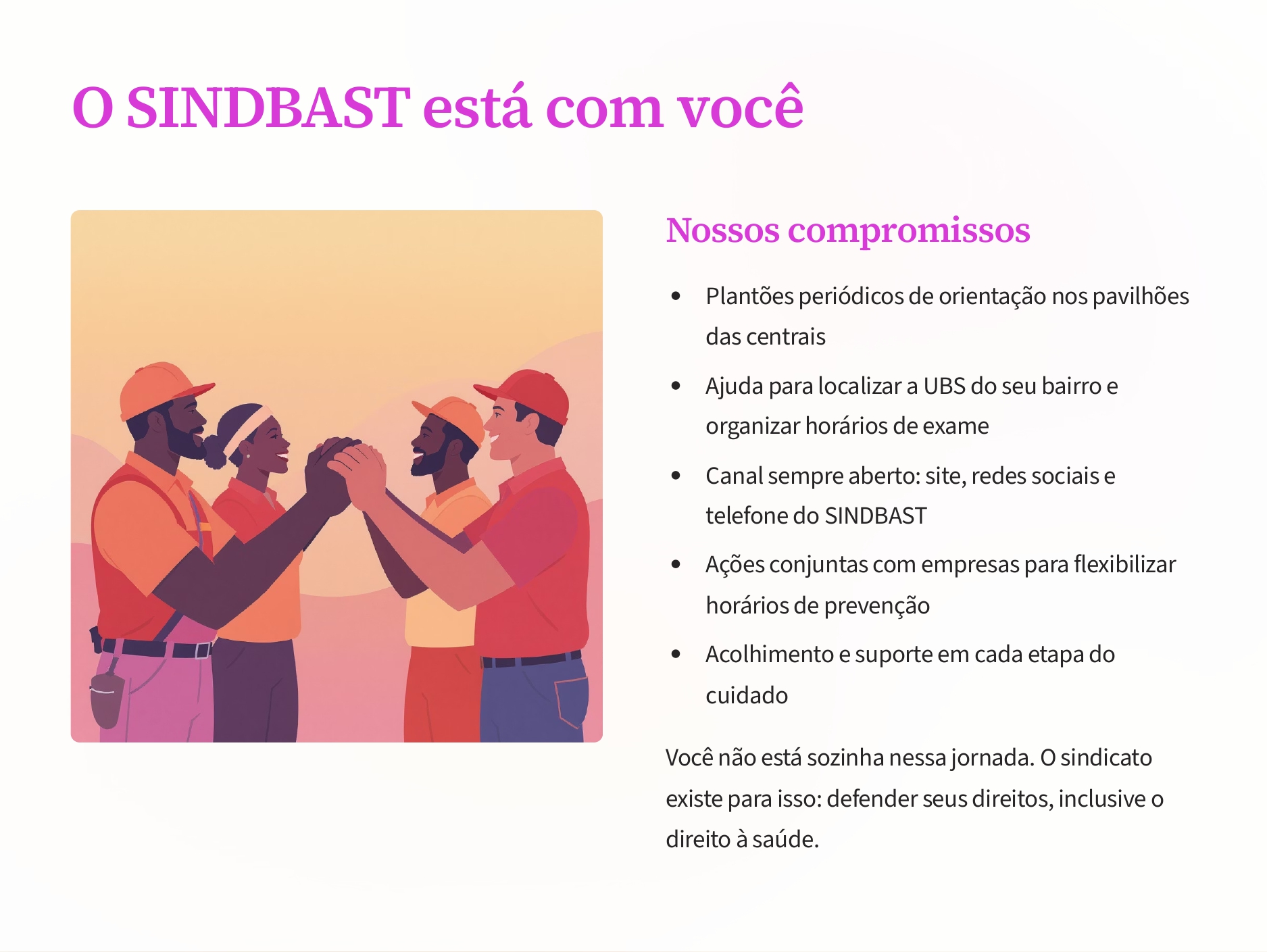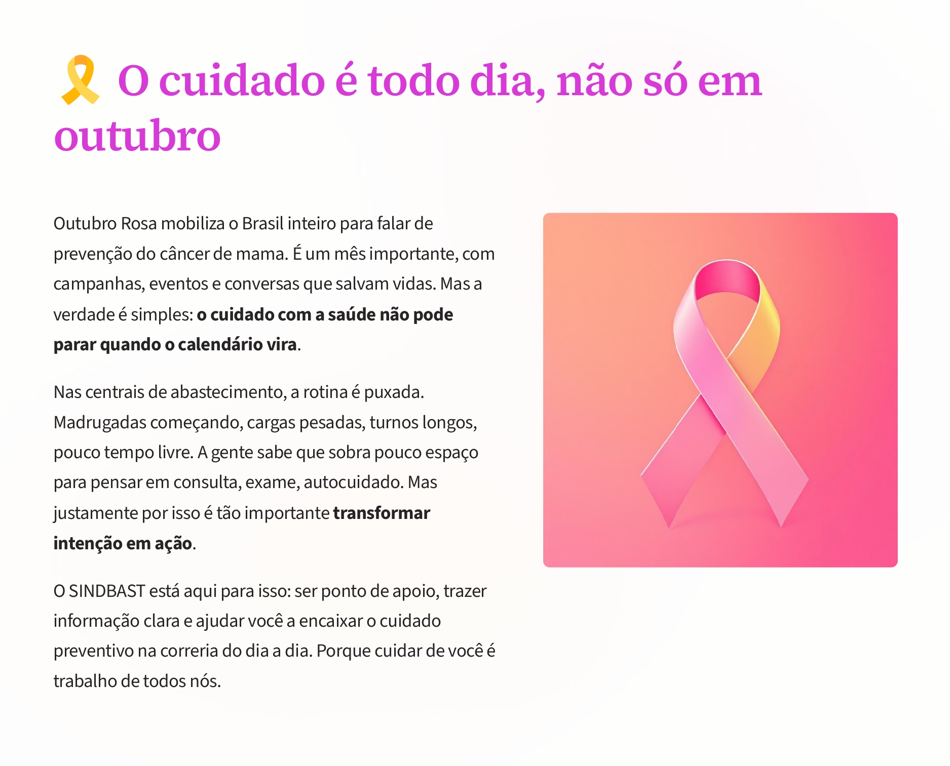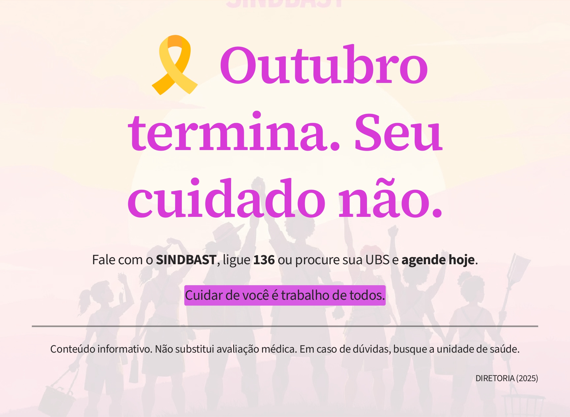 Notícias Sindbast Outubro passa. O cuidado fica. por SINDBAST Última Atualização 31 out, 2025 Compartilhar O SINDBAST está com você na prevenção que não termina em outubro. Compartilhar FacebookTwitterGoogle+ReddItWhatsAppPinterestO email